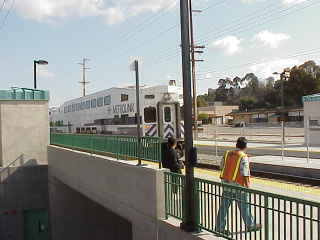 CLICK HERE The Orange County Register article appeared in the "Local" section of the Saturday, April 20, 2002, newspaper and was titled "Braking in new stop". Despite the implication in the article that the Metrolink trains "slowed down to take a closer look", all the trains that I saw appeared to speed through the station at full speed without slowing down at all. Early Saturday afternoon, my wife and I were driving to a restaurant for lunch. She was flipping through the Orange County Register newspaper, not looking for anything in particular. From the corner of my eye, I saw a photo of a Metrolink train on one page. I asked her to flip back to that page so that I could see how much coverage was provided to this event. When I got a better look at the photo, I was surprised to see that it not only showed a photo of a Metrolink train speeding through the new station, but also a picture of me on the platform taking a picture of that train, though it was only a picture of the back of me! Above on the left is a photo of that page from the Orange County Register and on the right is the photo that I took of the train at that moment. I am not too sure of exactly what to call this event. There were no speakers or any presentation, the train station did not open today and, thus, no trains stopped at the station today. However, there were a number of people from Metrolink, OCTA and the media on hand, plus there were balloons, banners, and lots of free pastries and beverages. Evidently there was supposed to be a station dedication today, but from what we heard, Governor Davis had to cancel at the last moment and the dedication has been rescheduled. A date that we heard mentioned was Monday, April 29, 2002. But, in any case, Metrolink trains will start serving this station on Monday, April 22, 2002. Since the event was originally scheduled to start at 8:45 A.M. this morning, Ray and I decided to meet along the way. Ray took a southbound Metrolink train that departed the Fullerton Station at 7:17 A.M. and I drove from my home in Anaheim Hills directly down the 241 toll road to the Irvine Station. I got there in time to see Ray's Metrolink train arrive at 7:53 A.M. The new Metrolink Laguna Niguel / Mission Viejo Station and the Tustin Station are expected to take a lot of the parking problem off of the Irvine Station. From what I saw at the Irvine Station, the parking lot was still pretty full even though the Metrolink Tustin Station has been open for a few weeks. However, the temporary free valet parking lot was definitely not as crowded as it used to be. The parking problem in Irvine will probably be further improved once Metrolink trains start serving this new Laguna Niguel / Mission Viejo Station on Monday, April 22, 2002. We then got into my car and drove to the new Metrolink Laguna Niguel / Mission Viejo Station via the 5 Freeway. The station is on Forbes Road just off the Crown Valley Parkway Exit on the 5 Freeway. There were signs pointing the way starting from the corner of Crown Valley Parkway and Forbes Road. A number of people were already at the station when we arrived. Metrolink had put up a mini-blimp in the shape of a Metrolink train. You can see a photo of that above. There were a number of tall round tables set up as well as one or two dozen chairs. There was a hostess serving free coffee, including cappuccino. The parking lot and all the festivities were on the southbound side of the track. A pedestrian tunnel is provided for those that need to get to the other platform, including an elevator for that are physically disabled. See the photos below. We observed a number of trains pass through the station. All of them were traveling at high speed and did not stop at the station. While I was waiting for a southbound Amtrak train, a person in an orange vest and hardhat instructed everyone to stand FAR behind the yellow line. He said that the Amtrak trains will often fly though the station at almost 90 miles per hour and that standing just behind the yellow line is still too close to the tracks. When the Amtrak train came flying through the station, it was obvious what he meant! Even though we were standing several feet behind the yellow line, we were all hit by a rush of air and papers went flying everywhere! Unfortunately, the in-house staff members of TrainWeb will not be able to cover the official dedication of this station if it does happen on Monday, April 29, 2002, as we will all be at the Amtrak Historical Society Annual Conference in Portland, Oregon. If any TrainWeb visitors are able to attend this event and send us any photos and materials from the event, we will be happy to publish those photos and provide credit.